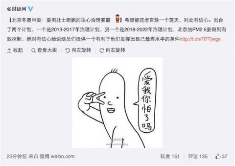 当晚,财经网消息引述北京冬奥申委新闻宣传部部长王惠的话称:“要用壮士断腕的决心治理雾霾,希望能还老百姓一个蓝天,对此有信心”,“出台了两个计划,一个是2013-2017年治理计划,另一个是2018-2022年治理计划,北京的PM2.5要得到有效控制,绝对有信心给运动员们提供一个有利于他们发挥出自己最高水平的条件……”。评论内容中一片哀鸣”太可怕了,不知道又会怎么折腾老百姓呢”。财经网官方微博发布该消息时搭配了一张反讽味道的图片(图1),图中文字显示“我爱你,怕了吗?”,这也是大陆媒体调侃时政新闻最大的尺度了。