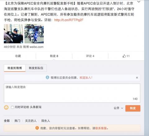 11月4号的法制晚报消息称:随着APEC会议召开进入倒计时,北京海淀巡警支队摩托车中队的干警们也进入备战状态,实行两班倒的“打铁班”,24小时值守在岗位上。记者了解到,APEC期间,所有参加勤务的摩托车巡逻组将配发新式警用左轮手枪,荷枪实弹参与安保。新浪微博@头条新闻 在发布这条消息时同样无法查看转发内容(图2),想必是跟帖中反驳和嘲讽太多了,屏蔽也是为了面子。