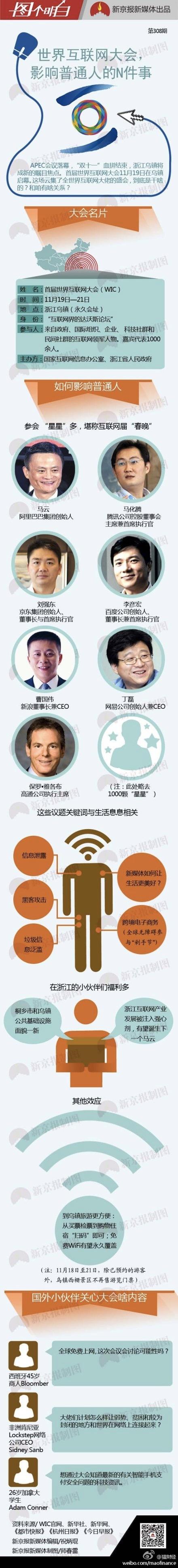 报道显示,本次大会将设立多个分会场并线召开,内容涵盖互联网治理、网络安全、互联网经济与文化、互联网科技等四个方面。新京报为此做了一张图片,其中有两处提及前期官方媒体明显一致性热捧的互联网经济。
