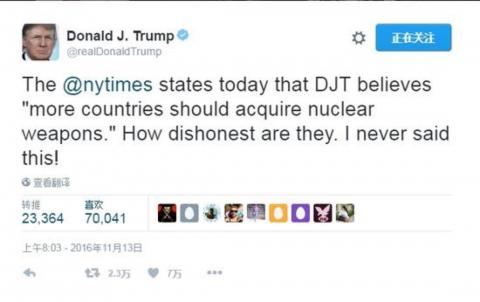 比如下面这条,他写道:“纽约时报今天声称特朗普相信‘更多国家应该持有核武器。’他们也太不诚实了!我从没这么说过。”有网友则直接找出记录来撕破谎言,当也有他的支持者通过逐字逐句地研究表示:“其实不能算是那么说了”…当信任的选择出现之后,为避免认知失调,人们会加倍为自己和别人解释,以证明没信错。这种时候,说服是很难起效的,哪怕是摆事实。