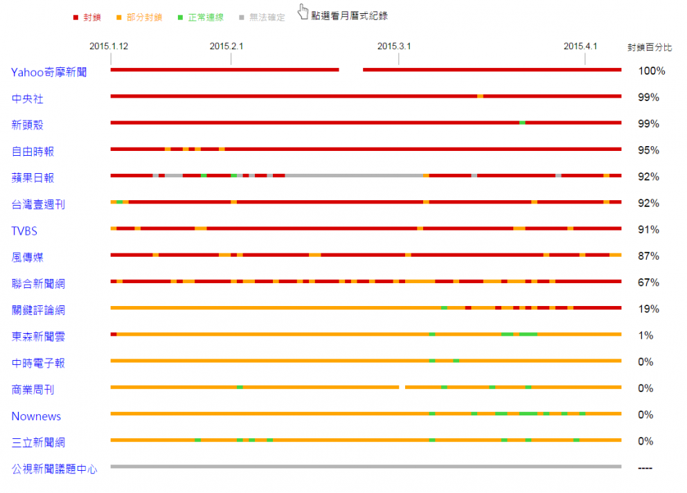 事实上,就算如东森新闻云等,虽然只有1%被封锁,各中原因亦是因为单一新闻网站首页每天新闻量极大,轮播或转换速度十分频繁,故无法就任何单一时段、单一页面的内容与“封锁”进行因果推论。而在3月份,该网站就只有6天能在内地正常连线。