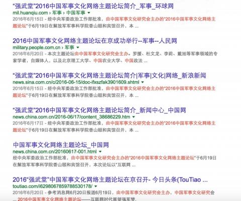 谷歌“2016中国军事文化网络主题论坛”能看到上百媒体或网站对相关报道通稿的转载,该消息发布于6月15号,网络舆论提示关注的时间是7月4号,这其间没有更多注意力指向该“论坛”相关内容。为什么呢,民间对网络管制已经审蠢疲劳了?不过还是有些值得关注的信息。